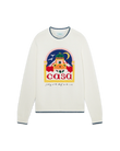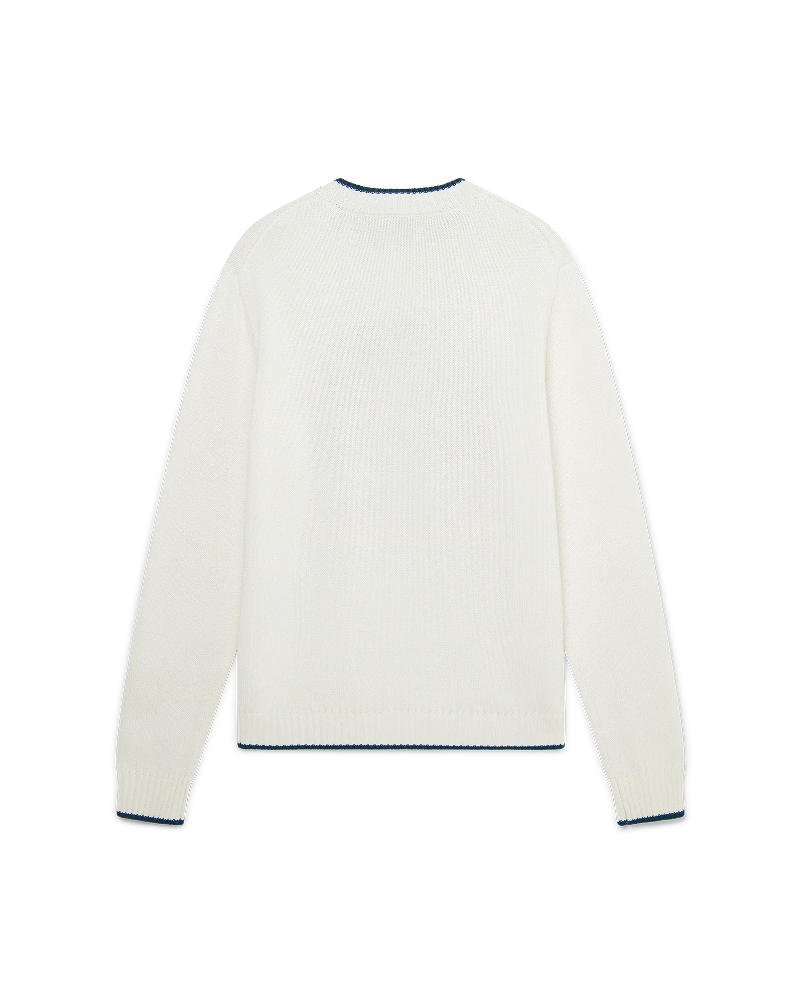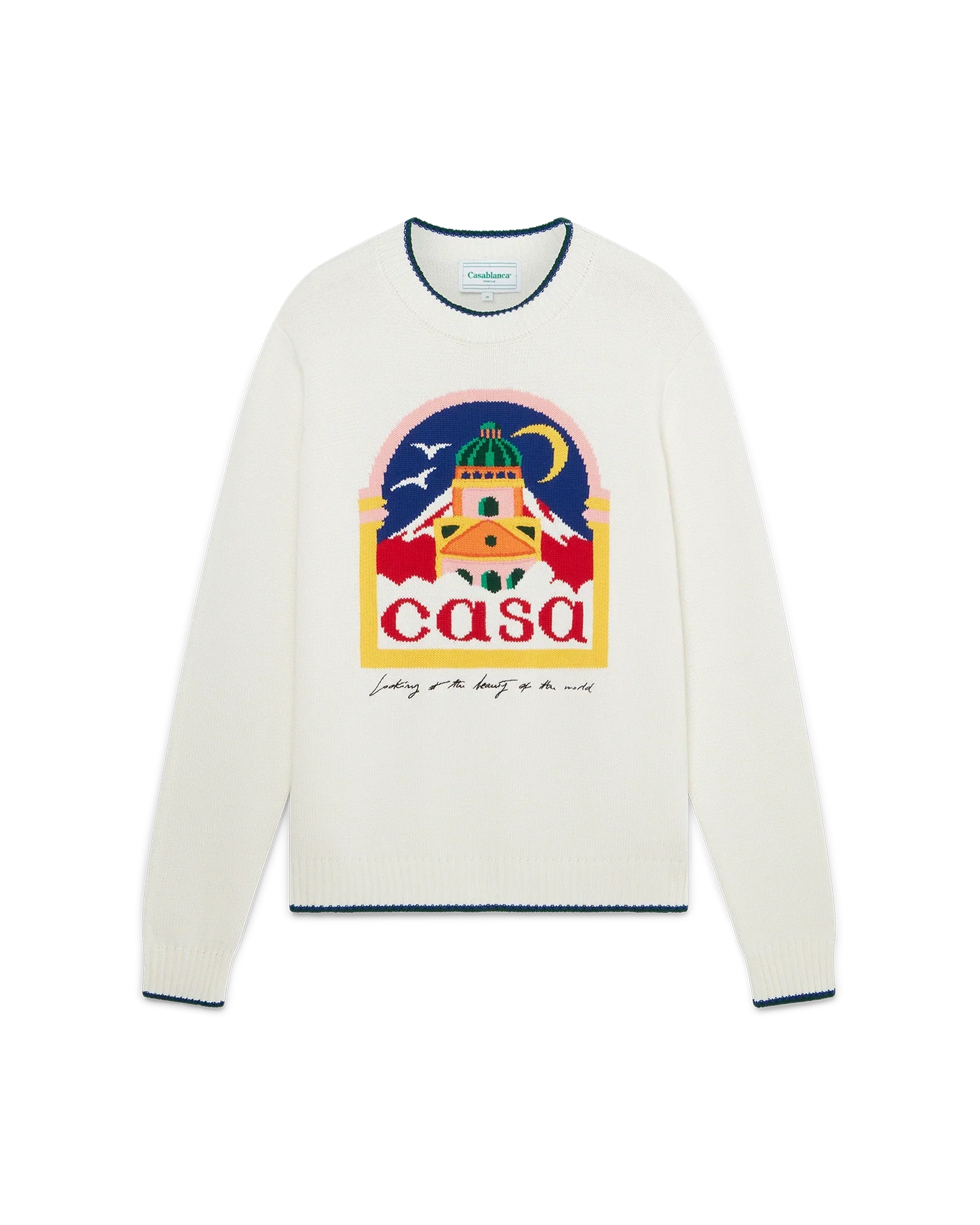 The Casa intarsia jumper is a white cotton knit featuring seasonal artwork taking visual cues from the beautiful and ancient city of Damascus. Made of 100% cotton, the style is a classic long-sleeved crew neck style with rib knit collar and cuffs and has been designed for a relaxed fit.