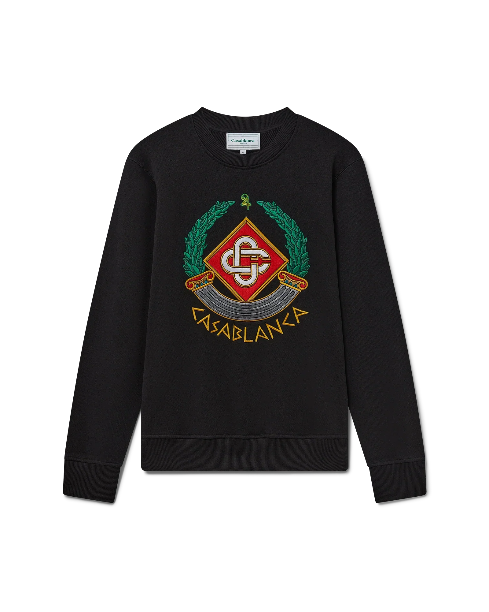 The Casa Crest sweatshirt is a long-sleeve design crafted from an organic cotton fabric featuring the house's play on the column as an iconography of Greece and our version of a warped logo, creating an image of what a Casa crest could be in ancient times. Completed with the house's signature interlocking CC logo, Casablanca text written in an ancient Greek style text, a classic crew neck, and rib cuffs and hem.