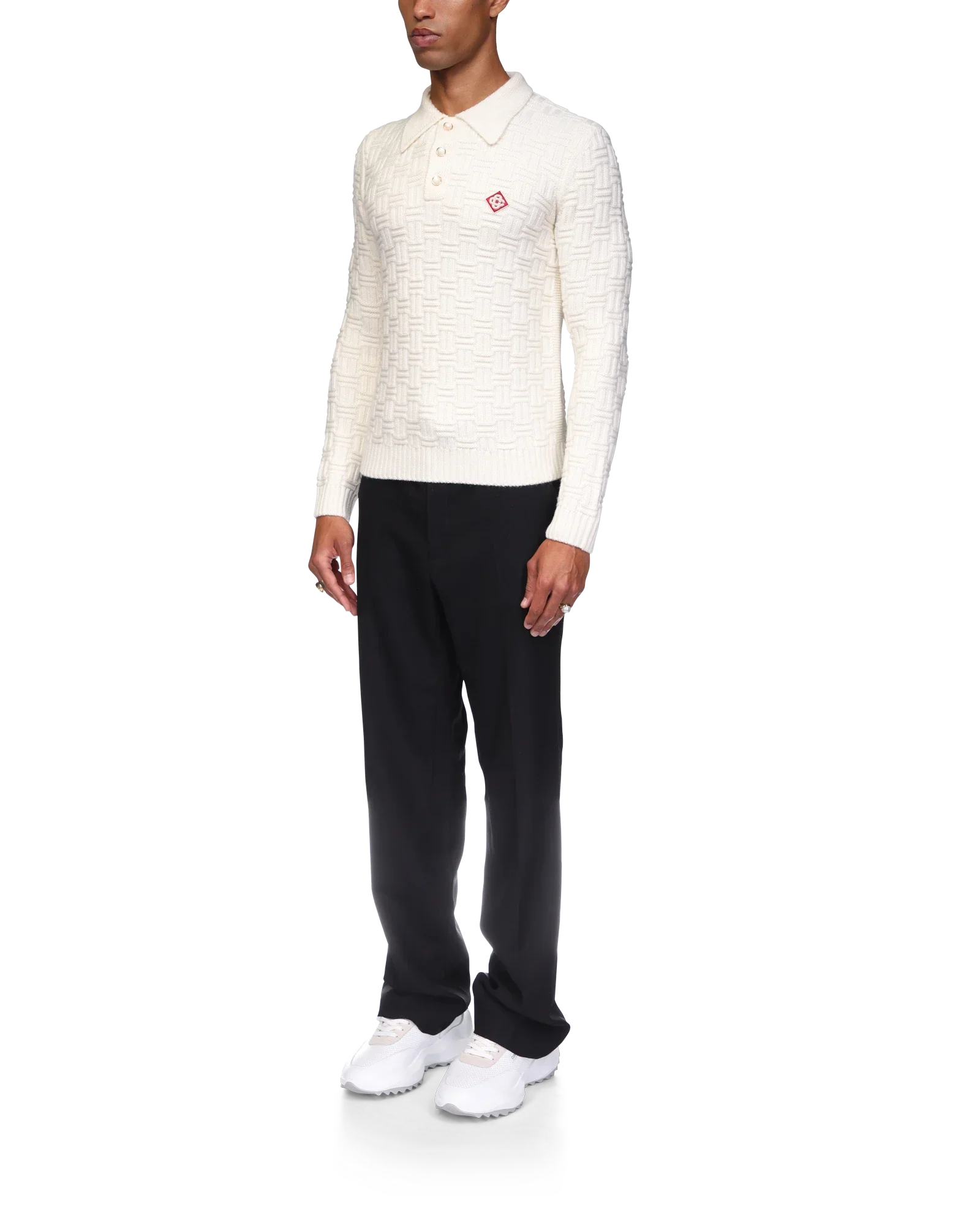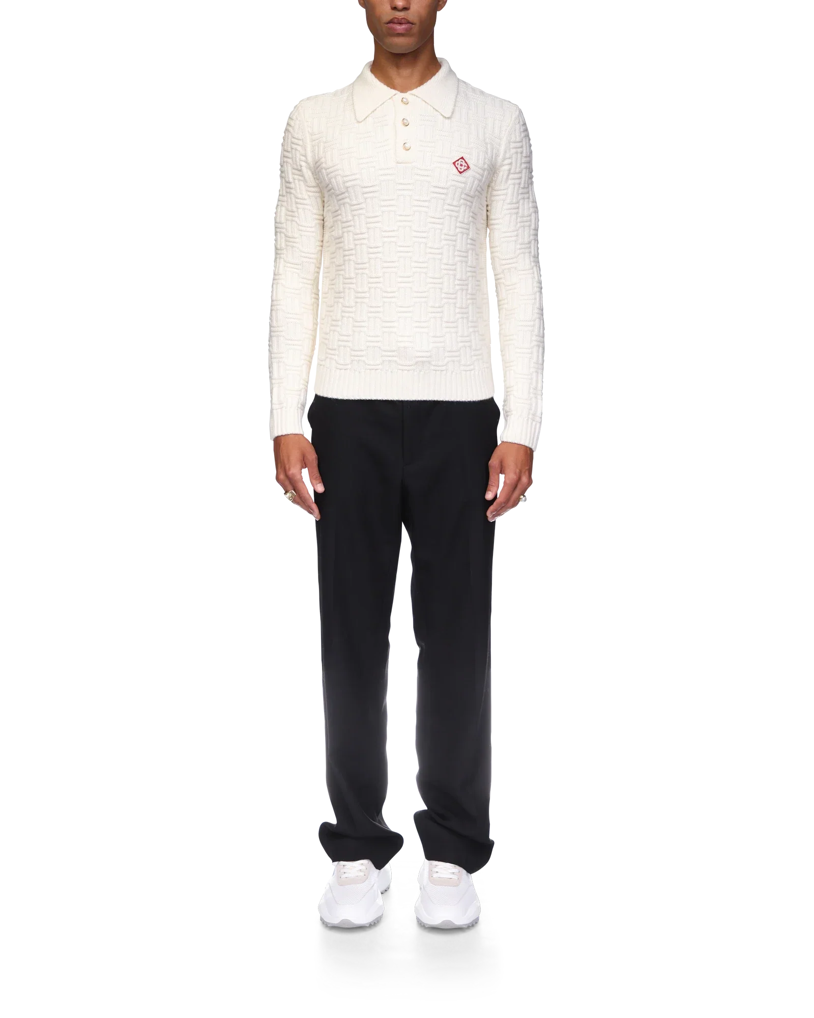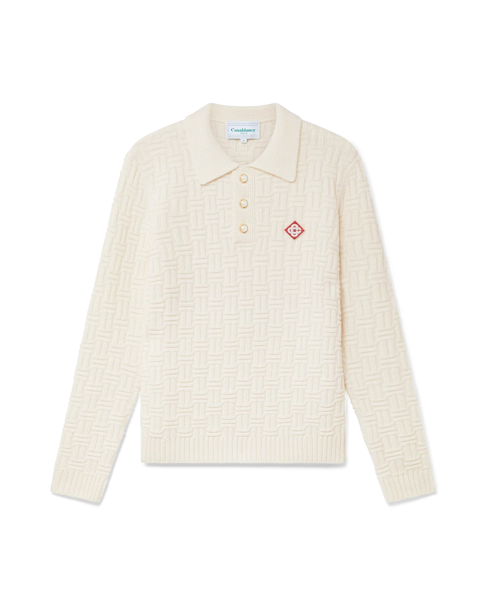 The column knit polo is a long-sleeved woven design crafted from a soft luxurious merino wool. Completed with the house's diamond logo, signature gold rim pearl buttons, a collar, and rib cuffs and hem detail.