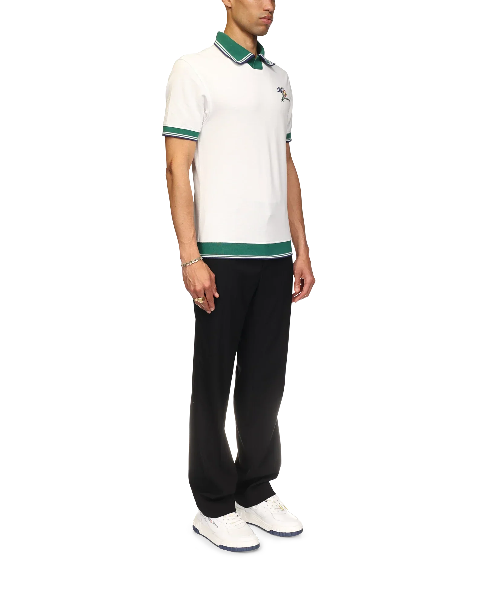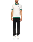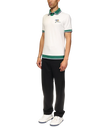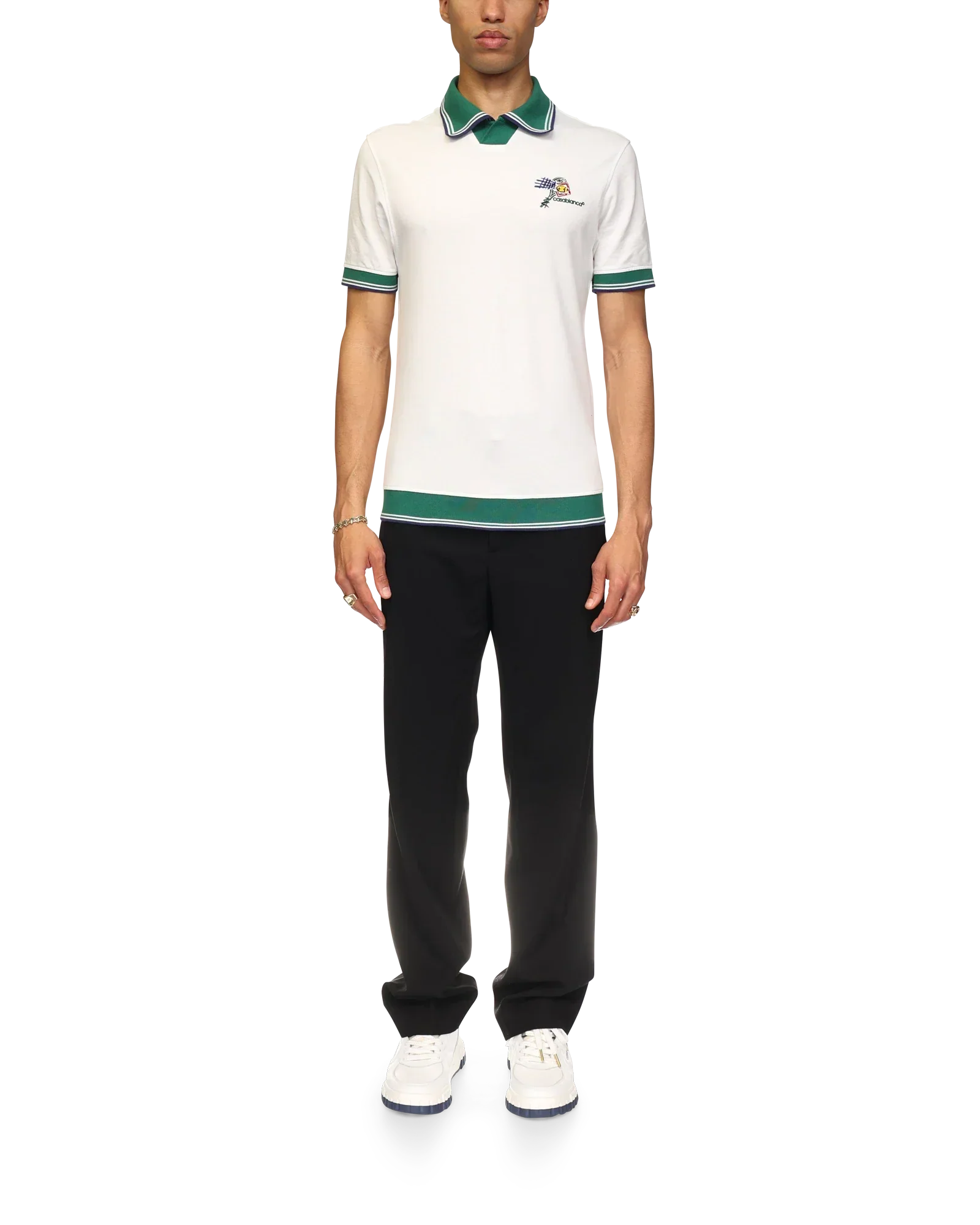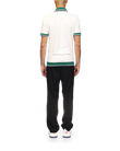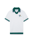 The Croquis De Tennis polo shirt is a short-sleeved design crafted from an organic cotton fabric, featuring the house's tennis-inspired seasonal artwork and Casablanca logo on the left chest. Completed with a contrast v-neck with a green, navy and white stripe collar, and contrast striped rib detail on the cuffs and hem.