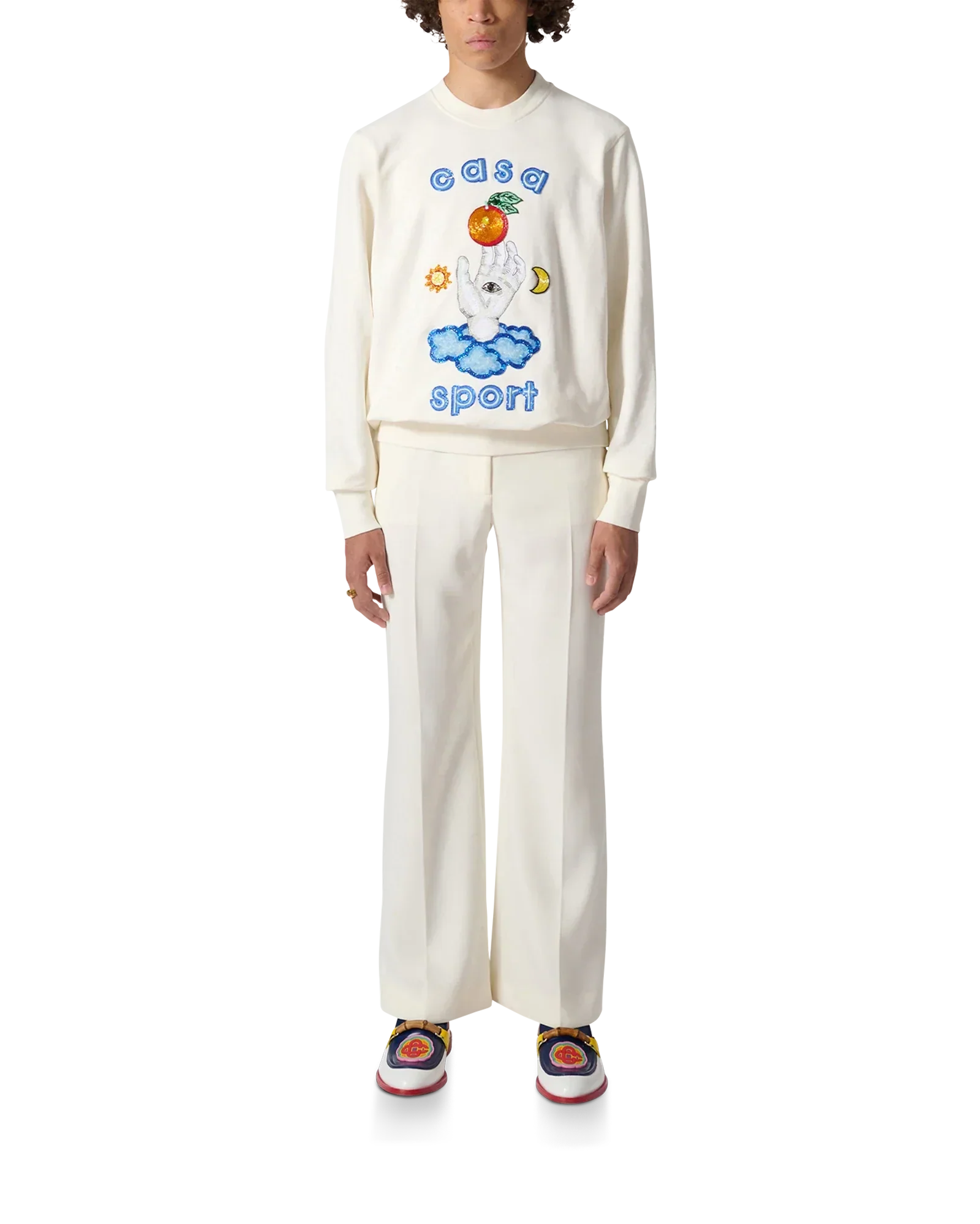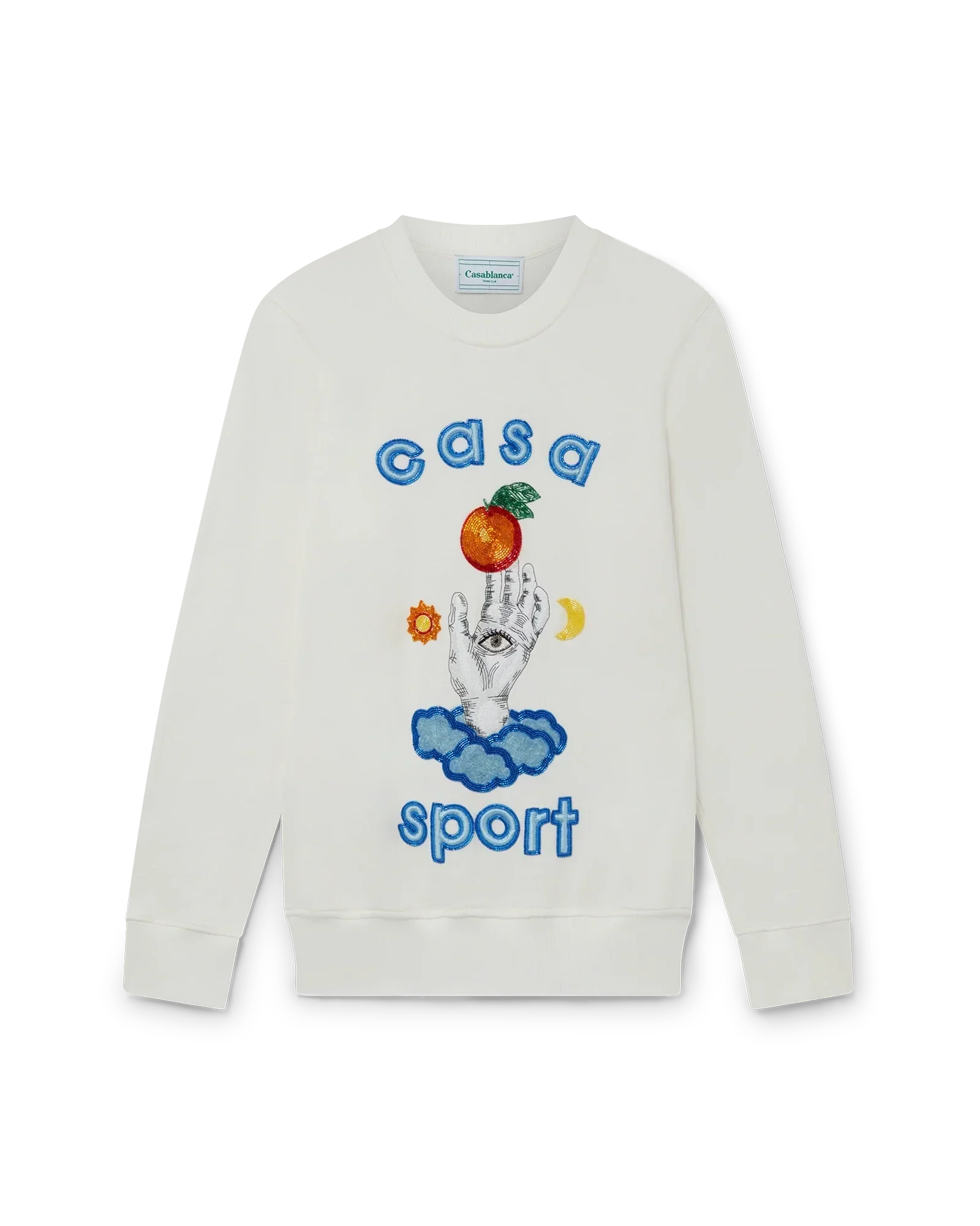 The Casa Talisman beaded sweatshirt is an elevated sportswear piece made of 100% off-white organic cotton. The classic crewneck style features a cheery embellishment design with glass beads and sequins and has been designed to have a relaxed fit.