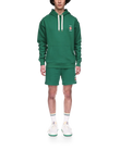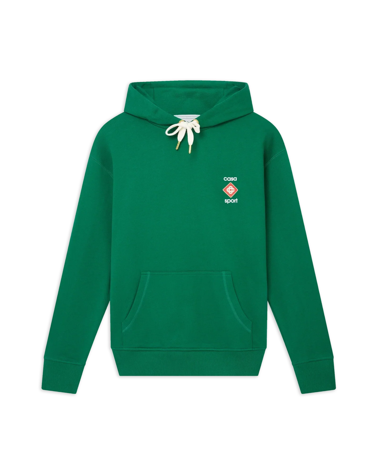 The Casa Sport Logo screen-printed green unisex hooded sweatshirt reinterprets the Casablanca Paris logo to sportif effect, which is then printed across the left chest. Crafted from organic cotton, the style is a classic long-sleeved hooded sweatshirt with ribbed hem and cuffs, designed for a relaxed fit.
