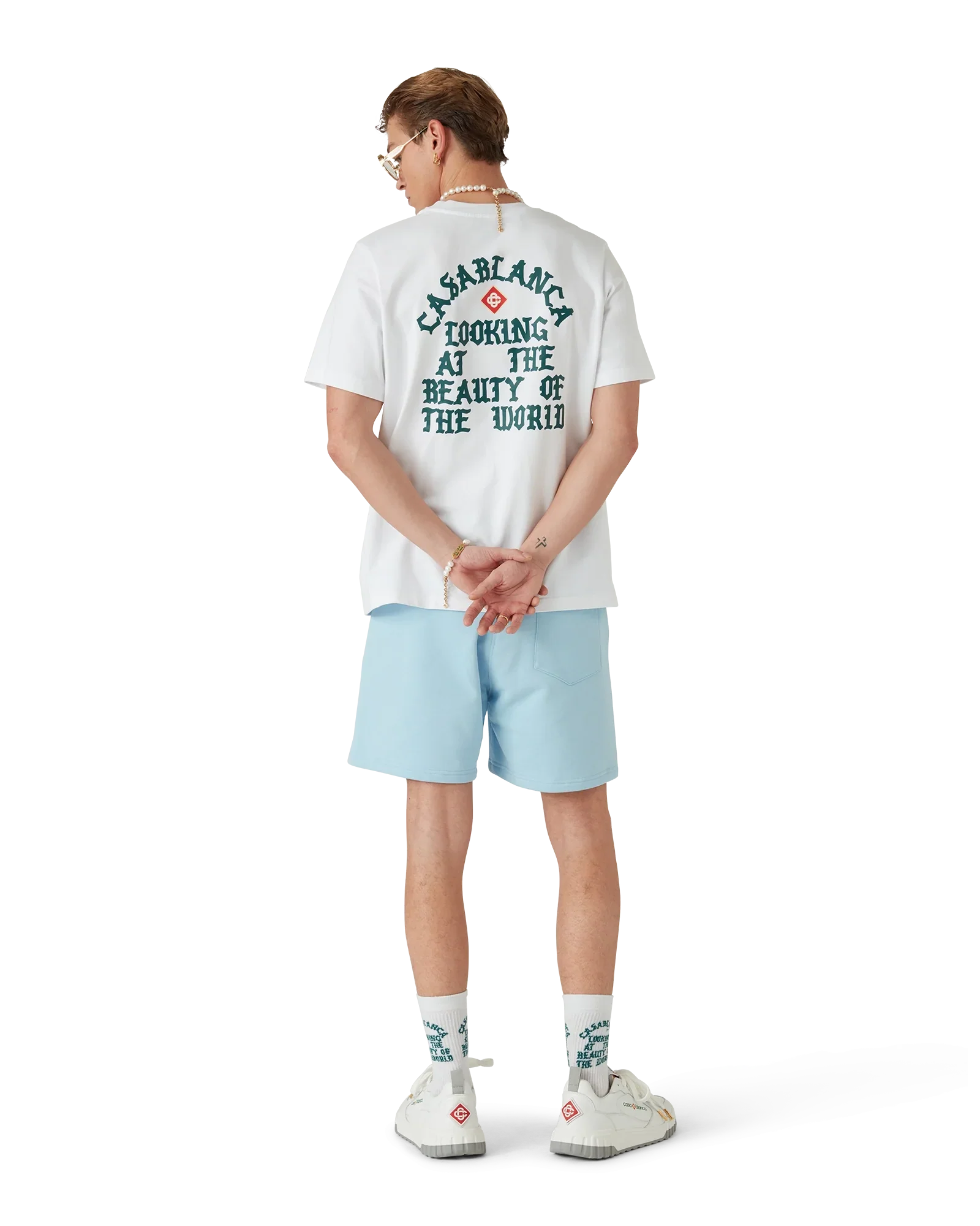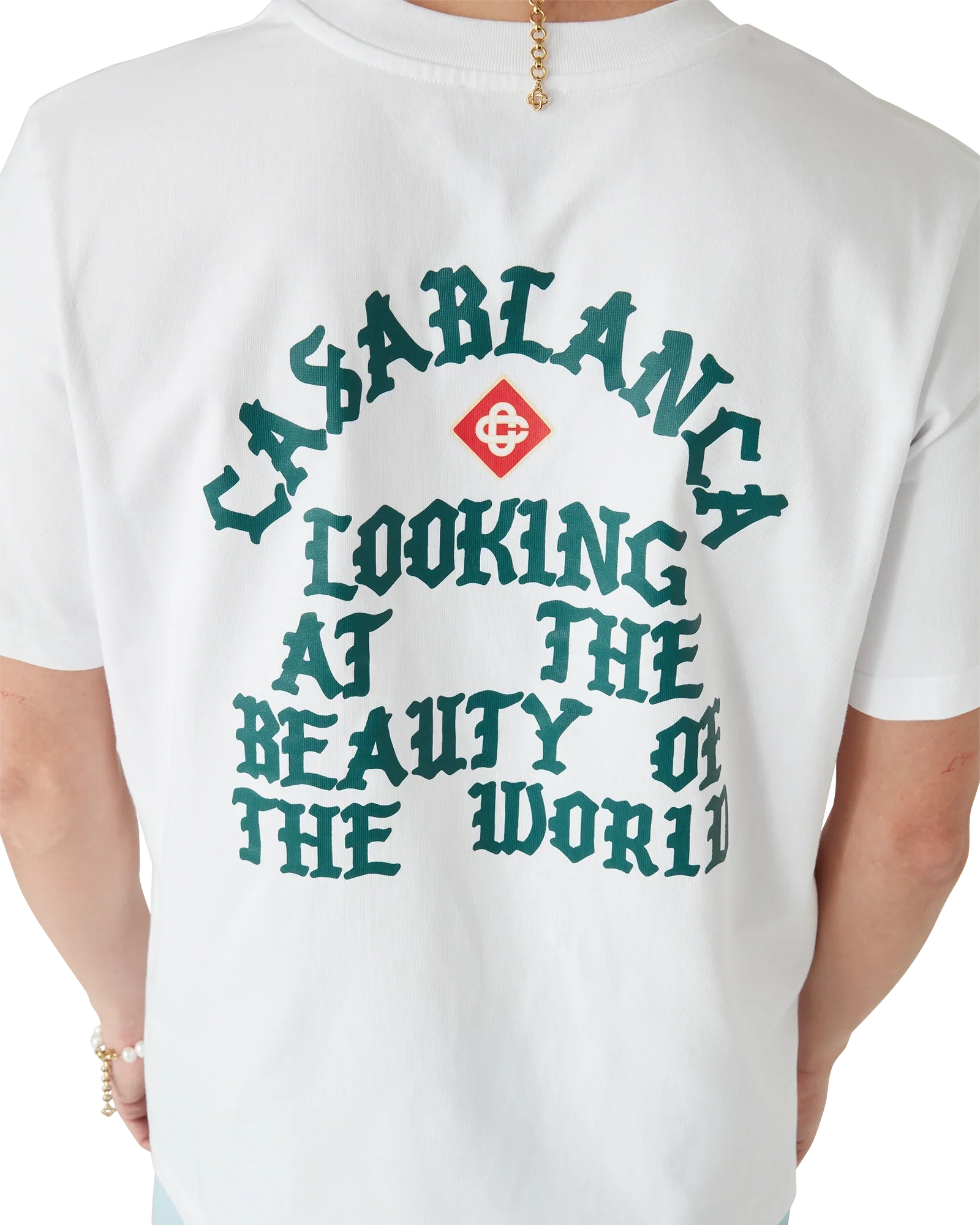 The Beauty of the World t-shirt is a short-sleeve printed design crafted from organic cotton fabric and features the Casablanca brand's motto in gothic typography inspired by LA street culture. Completed with a classic crew neck and the house's signature diamond logo. Please note our t-shirt sizing has been updated from SS25, we advise choosing your usual size. Previous clients seeking the same fit should size down.