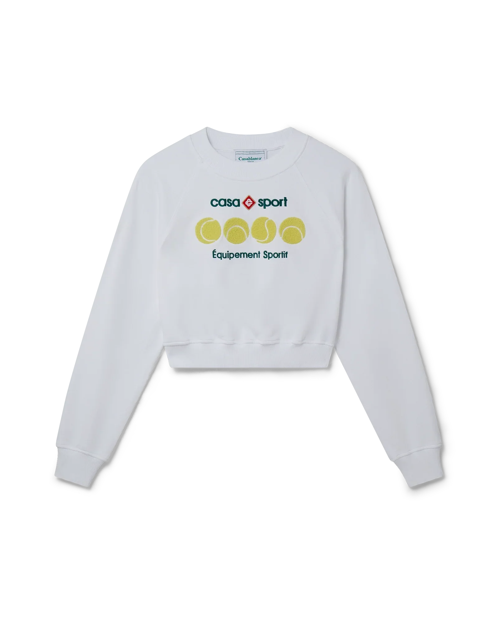 The Casa Sport Tennis Balls organic cotton embroidered cropped sweatshirt features seasonal artwork incorporating the house's signature tennis and Casa Sport iconography. Completed with a classic crewneck, long sleeves and Casablanca Paris branded label, designed to have a slim fit and finish above the navel.