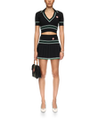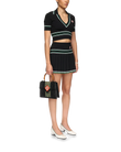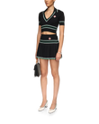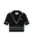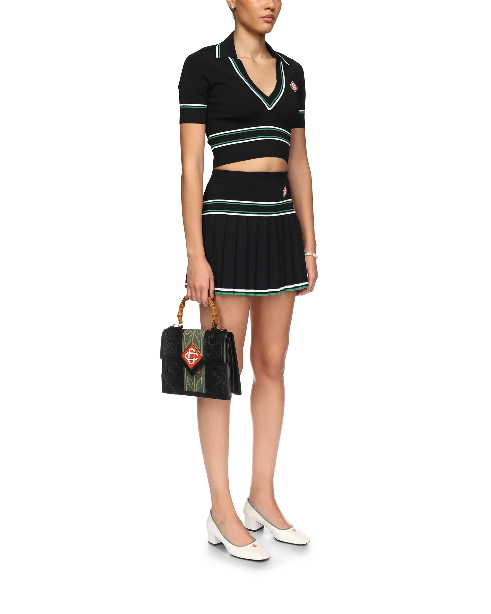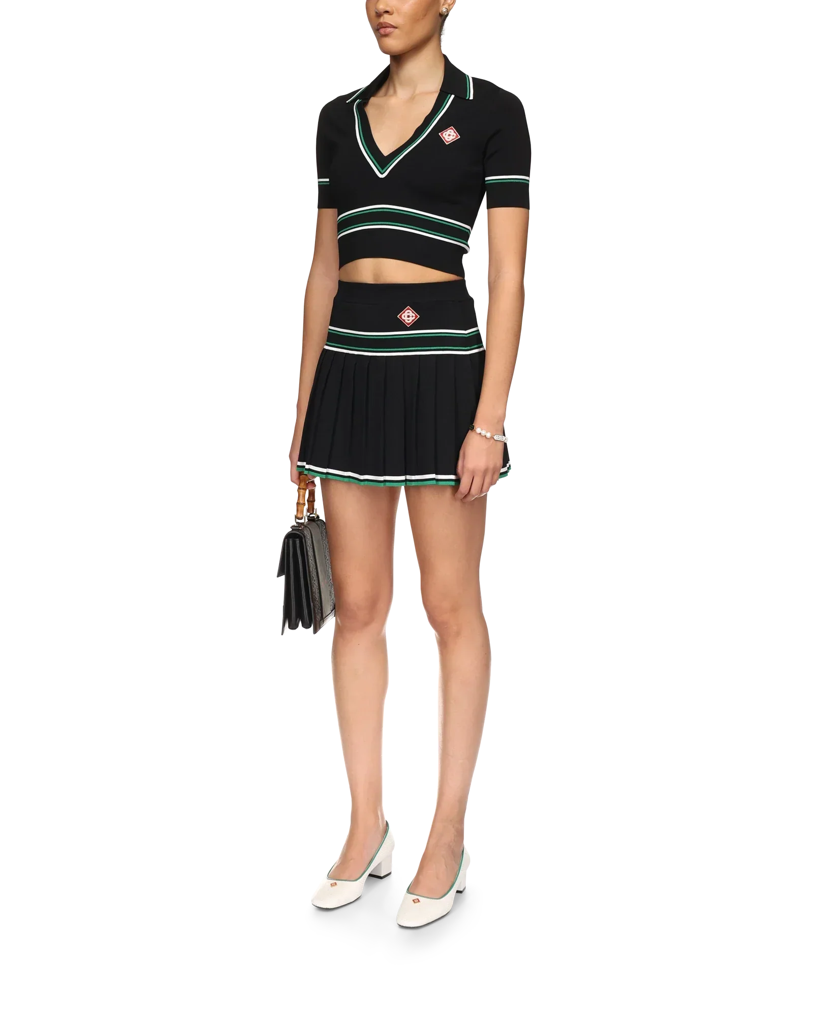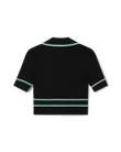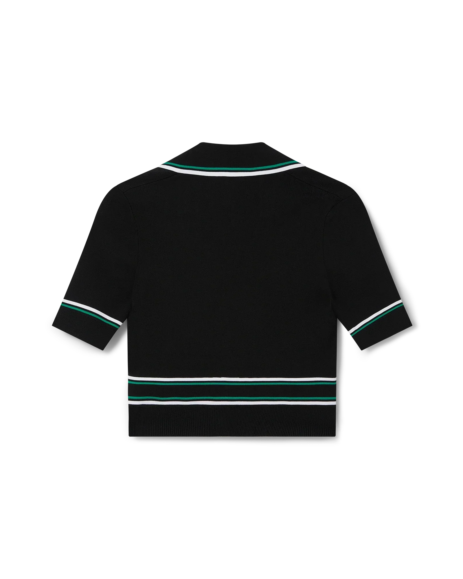 The cropped knit polo shirt is a short-sleeve short style crafted from a knitted fabric featuring the house's signature diamond logo. Completed with rib collar, cuffs and hem with contrast green and white stripe details and a deep v-neck, with an inner collar.