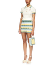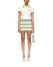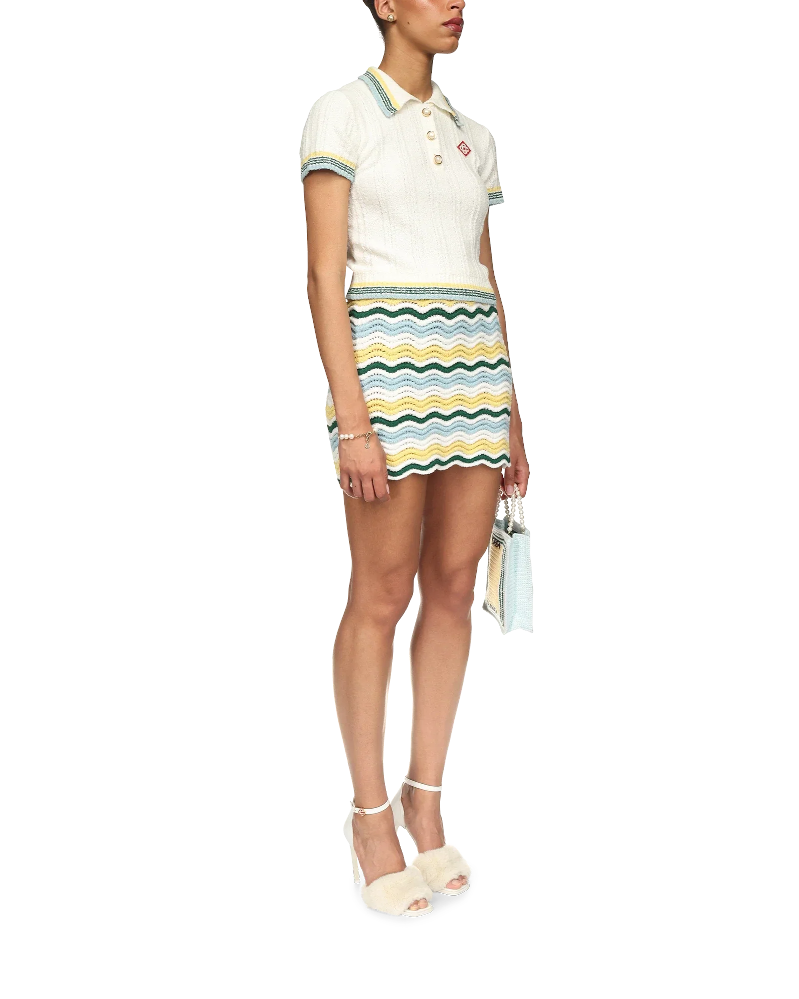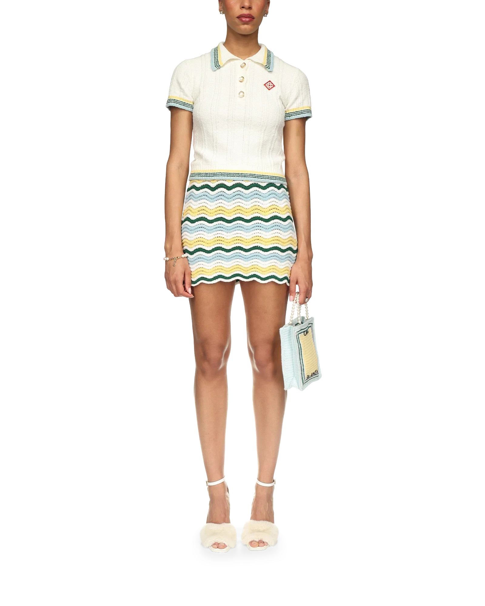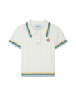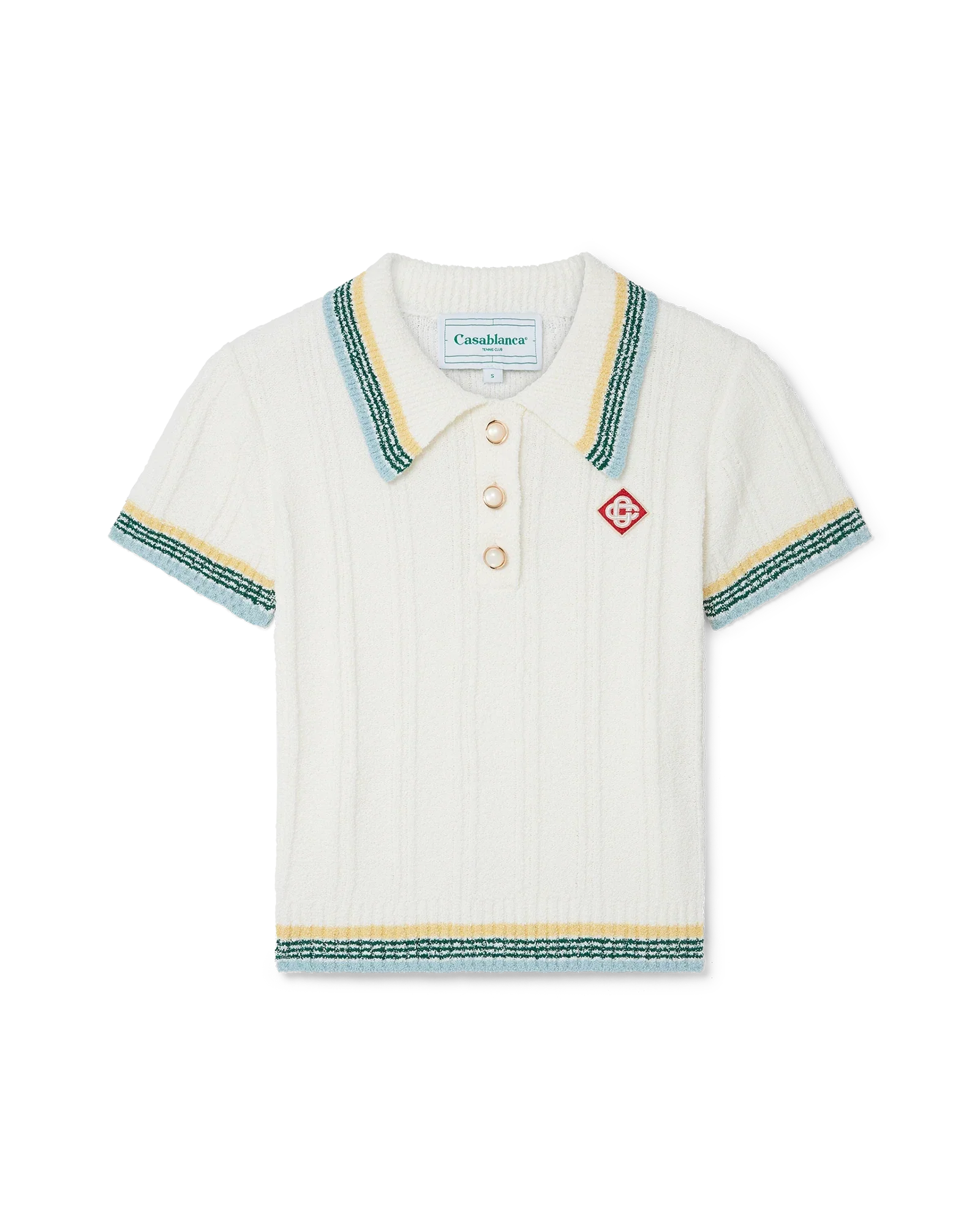 The rib boucle polo shirt is a short-sleeved design crafted from a cotton blend fabric with a soft rib texture and features the house's red diamond logo. Finished with gold rim pearl buttons, a Casablanca branded label and stripe detailing on the collar, cuffs and hem.