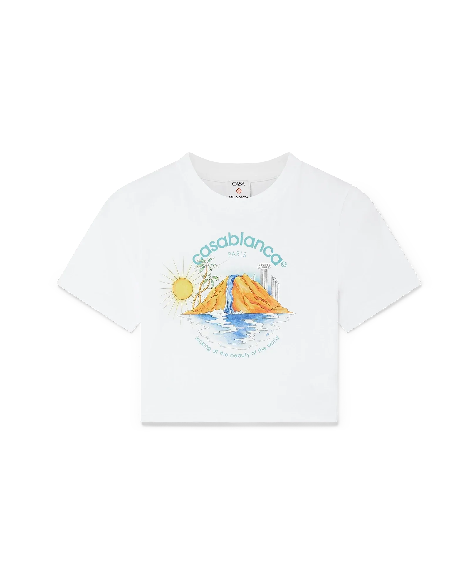 The Oasis cropped t-shirt is a short-sleeve printed design crafted from organic cotton fabric, featuring the house's seasonal artwork with design elements of nature, architecture, and tennis. Completed with a classic crew neck. Designed to fit above the navel.
